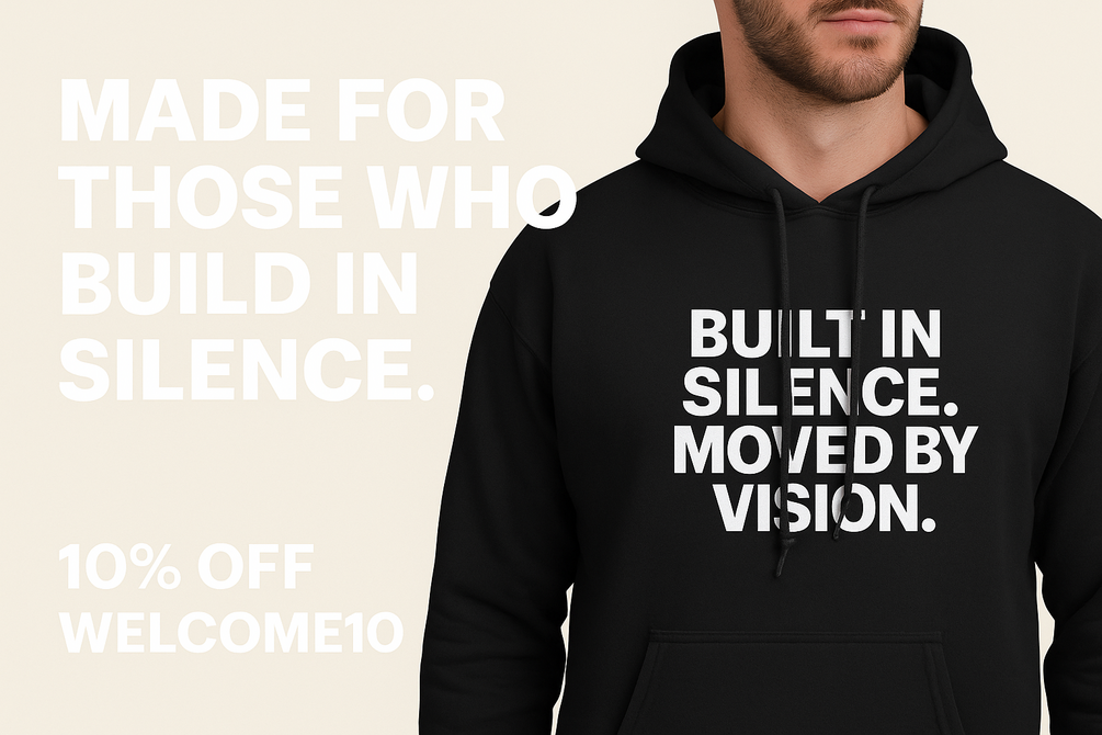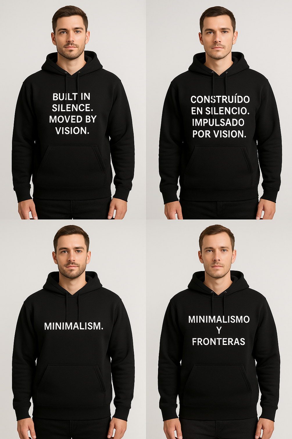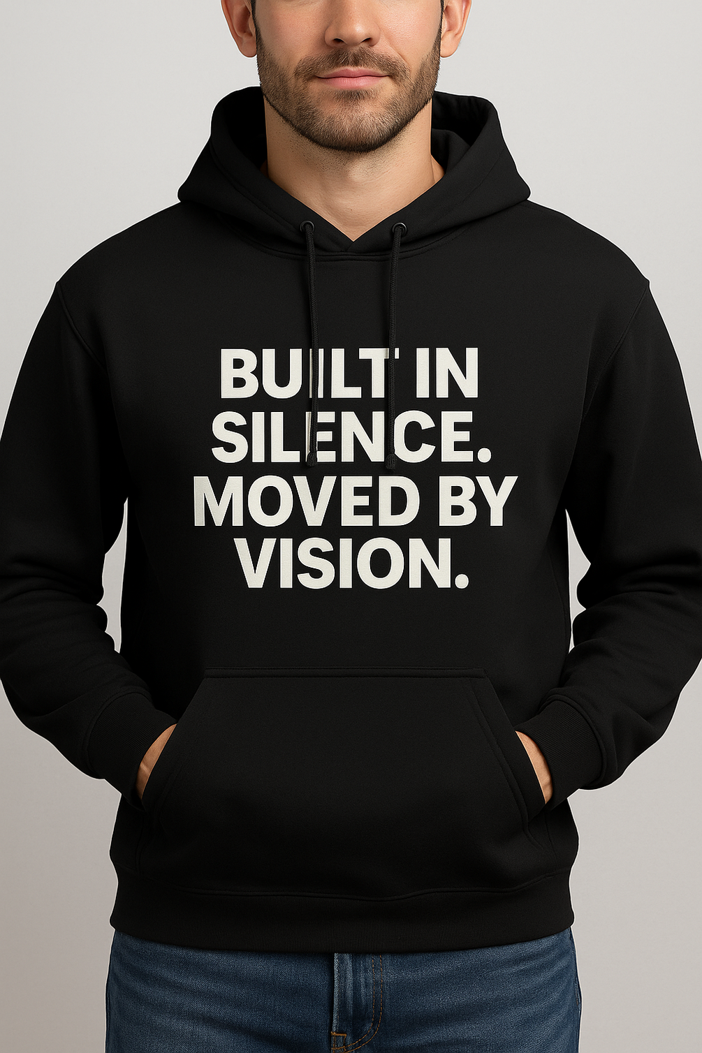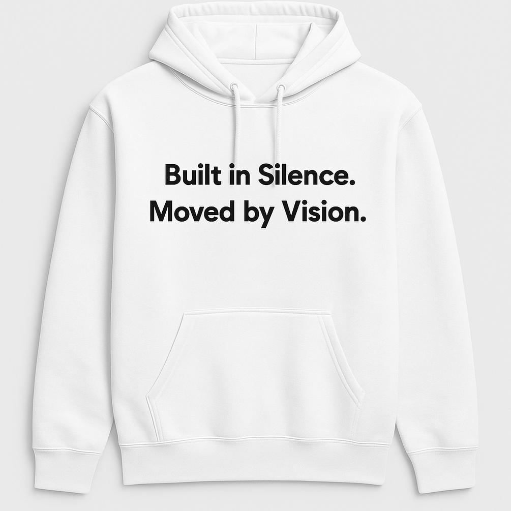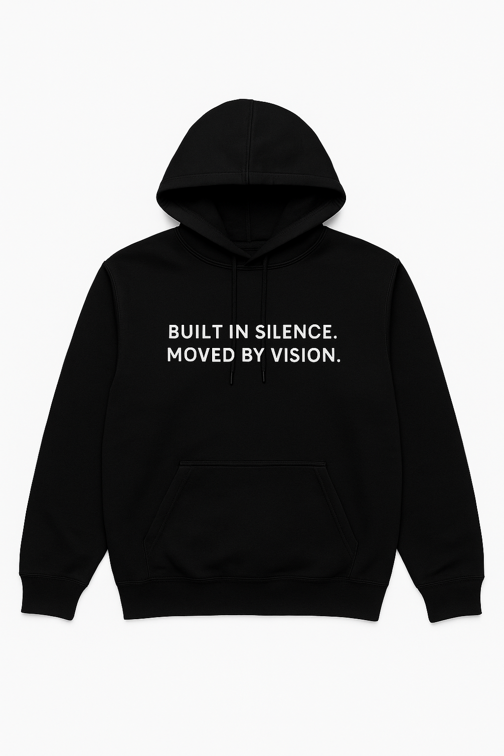 This hoodie is more than clothing — it’s a declaration. Built in Silence. Moved by Vision. Premium quality. Unisex fit. Available in Black, White, and Navy. ESPAÑOL: Esta hoodie es más que una prenda — es una declaración. Construido en Silencio. Movido por Visión. Calidad premium. Estilo unisex. Disponible en negro, blanco y azul marino.